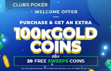 Clubs Poker has got a great deal for all of its new customers. It comes in the form of a first purchase bonus that will give you 100,000 Gold Coins as well as 20 free Sweepstakes Coins.