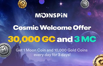 The Moonspin signup bonus is 30,000 Gold Coins and 3 Sweeps Coins. You get this offer in three parts — 10,000 GC and 1 SC on each of your first three days.