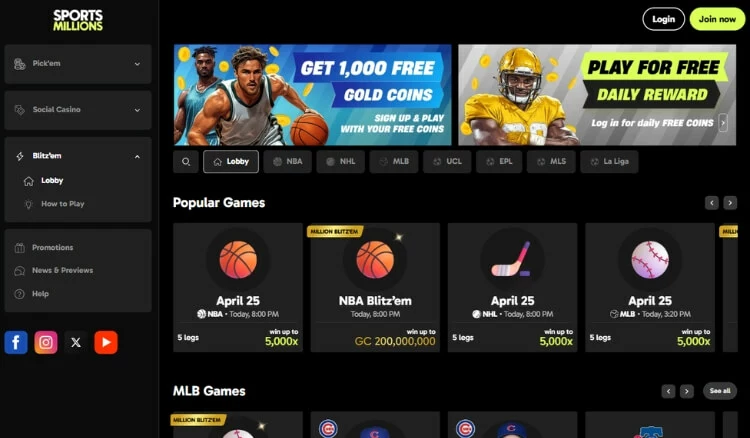 | SportsMillions | Blitz’em (sports prediction) and Pick’em (DFS-styled contests) |
