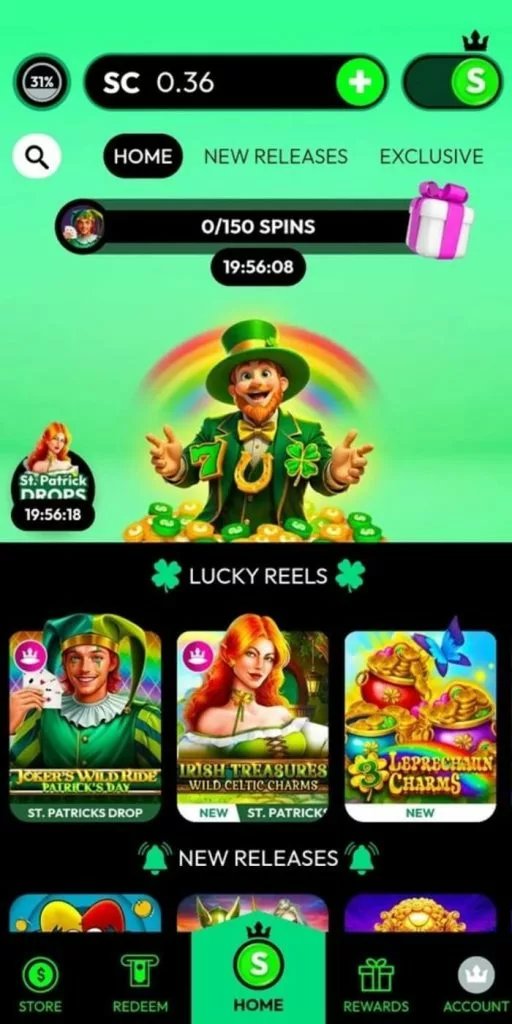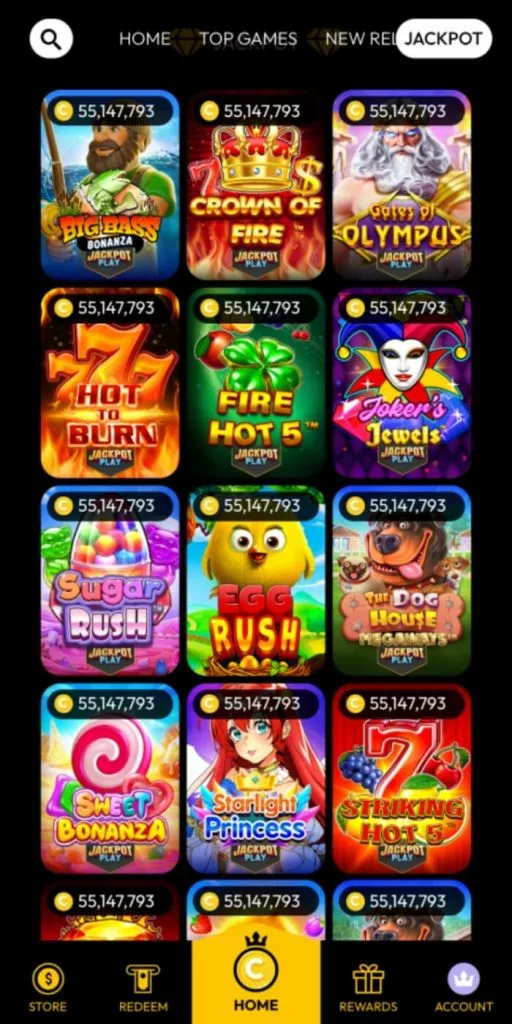 As the screenshots show, the design is highly optimized with a bottom menu. It takes only one click to access the Store to optionally purchase CC or the redeem section to obtain real prizes. The same applies to claiming bonuses via Rewards and managing your profile via Account. If you tap home, you get the complete game collection.