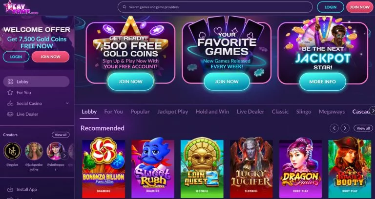 | PlayFame | 800+ | 10,000 GC + 3 SC | Regular new slot releases |