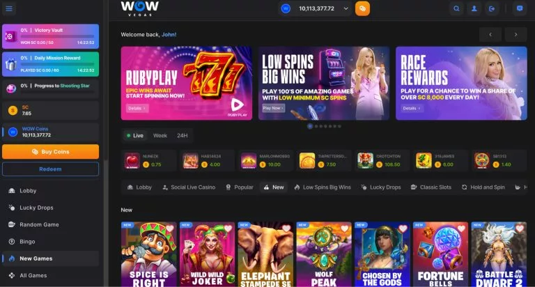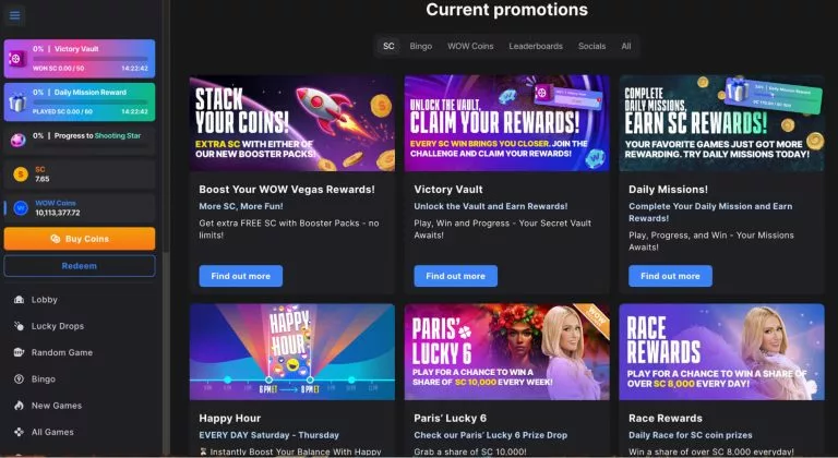 WOW Vegas is one of the best sweepstakes casinos, so it’s absolutely no shock that I’ve included it in my list of Stake.us alternatives. You’ll never be disappointed by WOW Vegas’ game selection as they have 1000+ slots to choose from, so if you’re new to the site, it’s definitely going to take a while to get through them all.