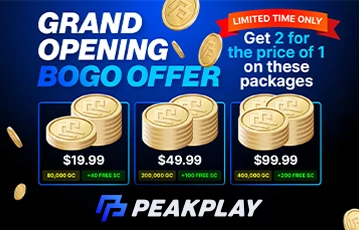 In addition to the PeakPlay sign-up bonus, this operator also has three Gold Coin package offers, referred to as the Grand opening BOGO packages, which offer 100% extra Gold Coins and free Sweeps Coins, hence the title “Buy One Get One” (BOGO). These packages on offer include:
